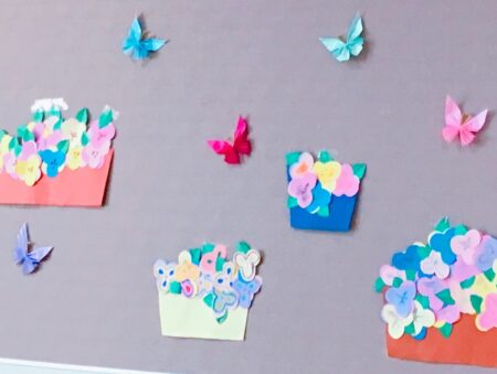 蝶も折り紙でおり、パンジーの庭に蝶が 羽ばたいているイメージで飾りました。
