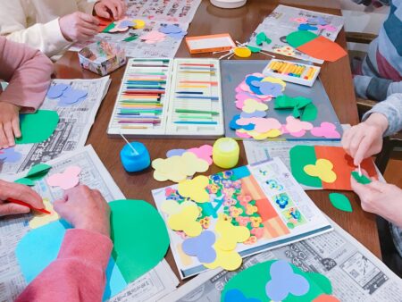 本日は、パンジーの花や葉を画用紙から切り取り、 クレヨンで花の柄を描き、プランターに貼っていきました。