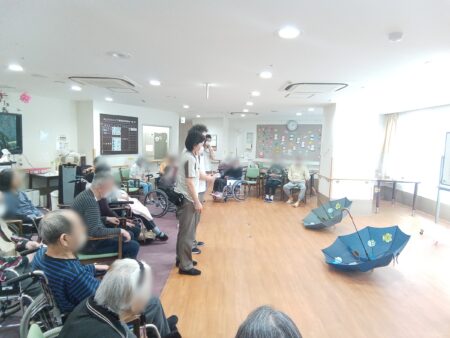 本日は、「傘玉入れゲーム」を行いました。