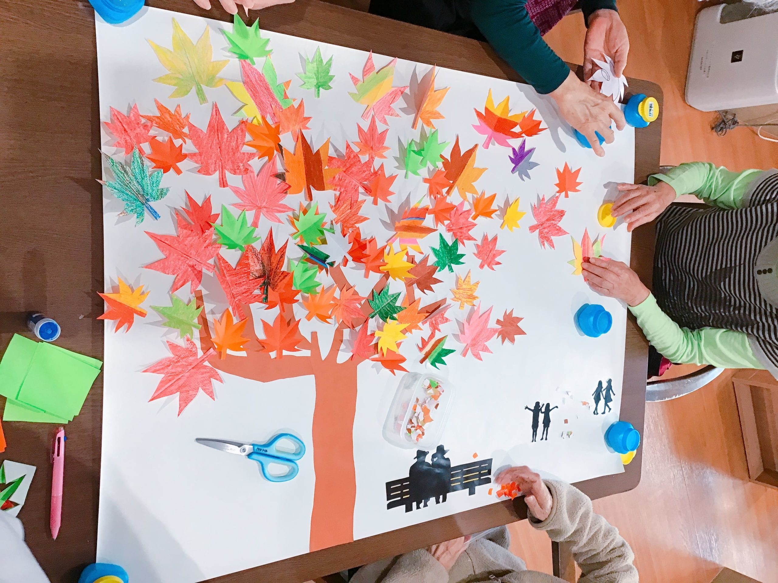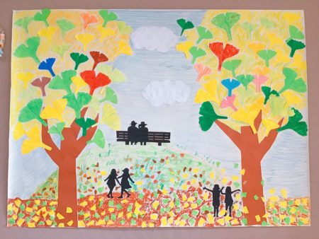 前回作成した紅葉やイチョウを、模造紙に貼っていきました。