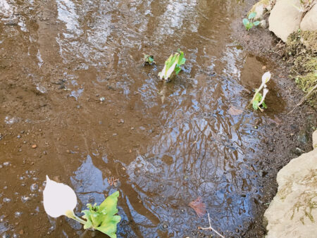 水路をのぞくと、せせらぎの中、水芭蕉がちょっこり顔を出していました。